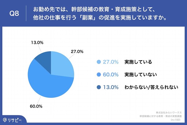 「Q8.お勤め先では、幹部候補の教育・育成施策として、他社の仕事を行う「副業」の促進を実施していますか。」(n=100)と質問したところ、「実施している」が27.0%、「実施していない」が60.0%という回答となりました。