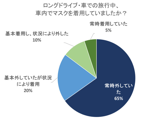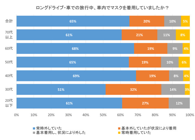 どの世代も「同居家族・同居人(67%)」と一緒にドライブする人が最も多い結果に。ドライブ時は約8割がマスクを外していることからも、車内は家と同じような空間と意識されている傾向が見られる。また、意外にも「一人」でロングドライブをしていた人も多く、特に40~60代では5人に一人が一人でのロングドライブを実施していた。「普段からよく会う友達・同じ会社の人」については、20代以下が他の年代よりも数値が多い結果となった。