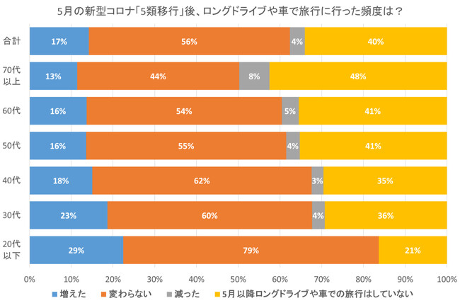 外出の頻度が「増えた」と回答した人は20代以下が最も多く(22%)、若い世代ほど積極的に出かける傾向が見られた。なお、「減った」「5月以降ロングドライブや車での旅行はしていない」の回答が最も多かったのは70代以上で、消極的さがうかがえる結果となった。(「変わらない」には、変わらず出かける、変わらず出かけないどちらも含む)
