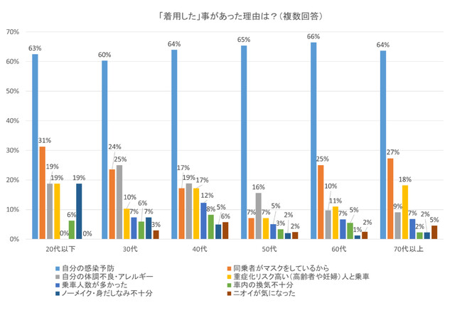 全体的には「自分の感染予防」が目立つ結果となった。しかし、「同乗者がマスクをしている」「自分の体調不良・アレルギー」「重症化リスクの高い人と乗車」といった同乗者への配慮する項目を合わせると多く、20代以下においては「自分の感染予防」を上回っていた。また、20代以下は「ノーメイク・身だしなみ不十分」の数値も他の年代よりも多く見られた。