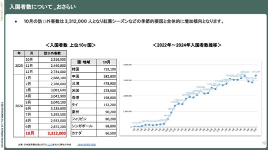 コロナ禍を経て訪日外国人旅行者は年々増加しており、2024年10月には入国者数が300万人を突破しました。その中でも、日本へのアクセスが良いアジア圏からの訪問者が多く、特に韓国からの訪問者が増加しています。消費行動については、国ごとに特徴があり、それぞれの消費傾向を正確に把握し、データを的確に分析することで、効果的な観光戦略の立案につながります。
