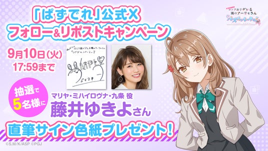 ストア事前予約開始を記念して開催される7週連続キャンペーンの第3弾はマリヤ・ミハイロヴナ・九条役のCVを担当する藤井ゆきよさんのサイン入り色紙をプレゼント!本日9月4日(水)より開始され、抽選で5名様に当たります。ふるってのご応募お待ちしています!