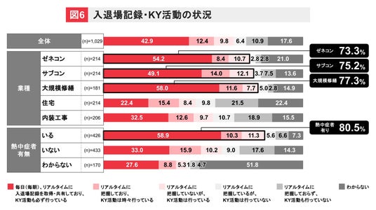 過去に熱中症患者が発生した現場では、実に80.5%の企業がKY活動を実施しています。これは、熱中症リスクが高い現場において、KY活動を通じた危険予知と安全意識の向上が、より積極的に行われている現状を示唆しています。(図6)
