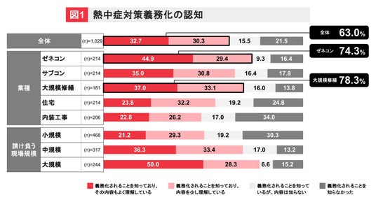 加えて、大規模現場での認知は78.3%、小規模現場では50.5%となり、業種と現場規模により意識の差がある結果となりました。(図1)