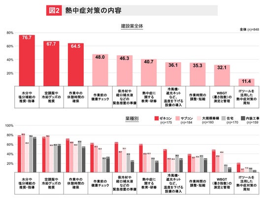 特にゼネコンでは、これらの対策に加え、「保冷剤や経口補水液などの緊急措置の準備」「作業前の健康チェック」「熱中症に関する教育・研修」といった、より包括的な健康管理や教育体制の構築も6割以上が取り組んでいることが特徴です。(図2)