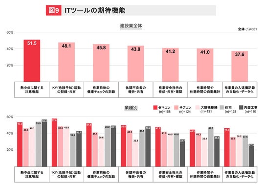 ITツールに期待する機能としては、全体で「熱中症に関する注意喚起」がトップであり、ゼネコンでは「KY活動の記録・共有」が、また大規模現場では「作業前後の健康チェックの記録」「作業時間や休憩時間の自動集計」「作業員の入退場記録の自動化・データ化」への期待が高いことが明らかになりました。これは、義務化された「早期発見・対応」のための報告体制や実施手順の整備において、ITツールが重要な役割を担う可能性を示しています。(図9)