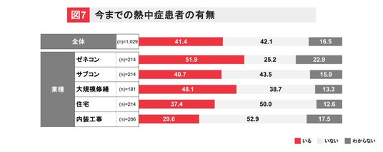 参考(図7):過去の熱中症患者の有無に関しては、ゼネコンで51.9%、大規模現場で52.5%が「いる」と回答しました。