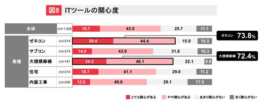 建設現場における安全衛生・労務管理効率化のためのITツール導入への関心は高く、全体の63.2%が「関心あり」と回答しました。特にゼネコン(73.8%)や大規模修繕(72.4%)で関心度が非常に高い結果でした。(図8)
