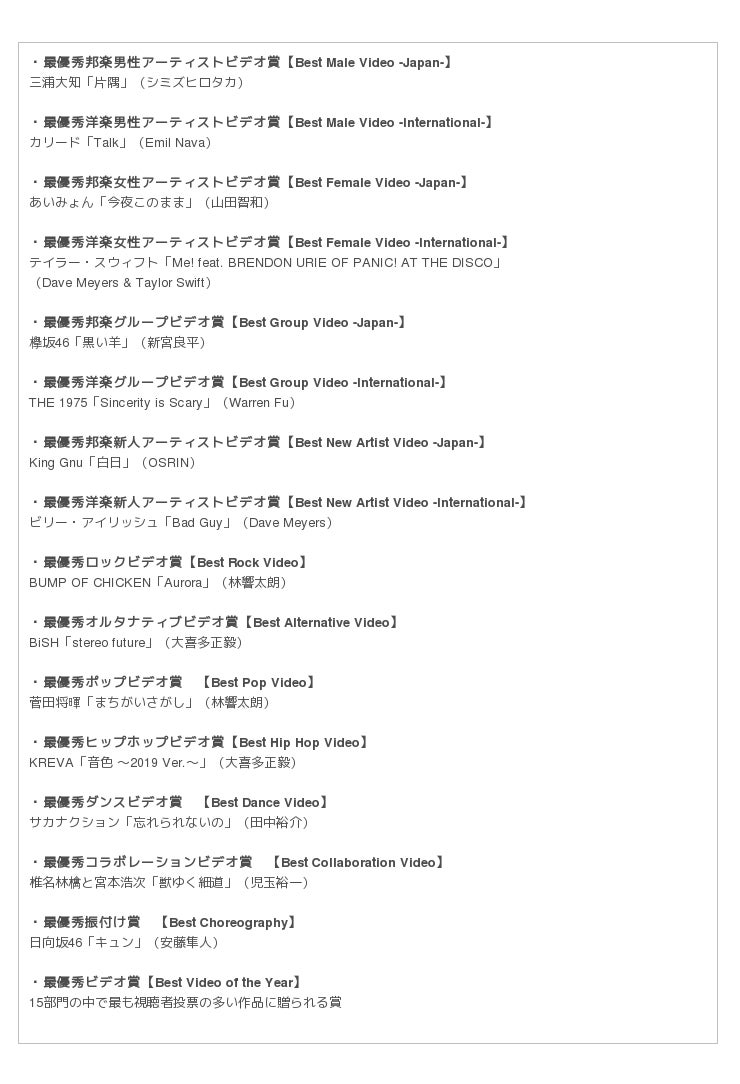 ※ 2018年8月1日~2019年7月31日に国内で発表された洋楽・邦楽全楽曲のミュージックビデオを対象に、世界各地のMTVクリエイティブディレクターから構成される選考委員会が選出。
