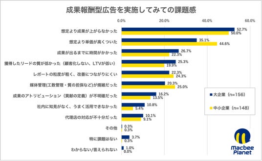 最後に成果報酬型広告の導入後の課題について尋ねたところ、大企業では「想定より成果が上がらなかった」(52.7%)が、中小企業では「想定より単価が高い」(44.6%)が上位となり、成果の定義や単価に関する悩みが存在していることが明らかになりました。