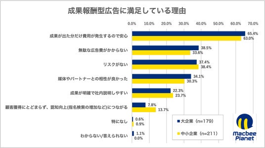 成果報酬型広告に満足している理由については、「成果が出た分だけ費用が発生するので安心」(大企業:65.4%、中小企業:63.0%)が最も多く、次いで「無駄な広告費がかからない」(大企業:38.5%、中小企業:33.6%)、「リスクがない」(大企業:37.4%、中小企業:38.4%)と、“無駄を削減できる仕組み”に満足感を覚える企業が多い傾向となりました。