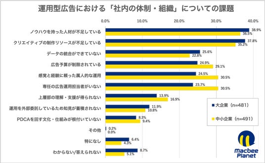 また、運用型広告における「社内の体制・組織」の課題感についての質問には、大企業、中小企業ともに「ノウハウを持った人材が不足」、「クリエイティブの制作リソースが不足」が顕著に現れ、自社だけで運用することの体制面での課題が浮き彫りになりました。