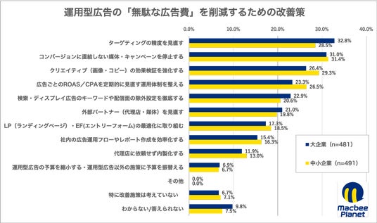 さらに、運用型広告での「無駄な広告費」を削減するための改善策について尋ねたところ、大企業で「ターゲティングの精度を見直す」(32.8%)、「コンバージョンに直結しない媒体・キャンペーンの停止」(31.0%)、「クリエイティブの効果検証を強化」(26.4%)が挙げられ、中小企業についてもほぼ同様の結果となりました。