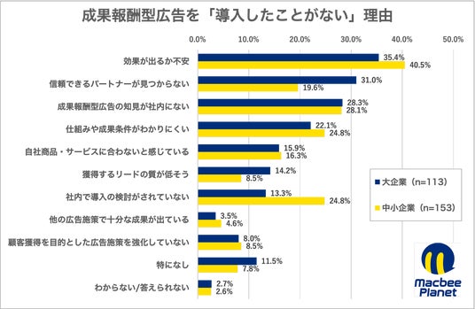 一方、成果報酬型広告の未導入理由としては、大企業と中小企業どちらも「効果が出るか不安」が最上位に挙げられました。また、大企業では「信頼できるパートナーが見つからない(31.0%)」といったパートナー選定の不安が導入の障壁として挙げられました。