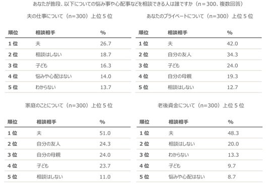 また、普段、悩み事や心配事などを相談できる人が誰かを聞いたところ、悩み事や心配事の内容に関係なく「夫」との回答が最も多い結果となり、夫が一番の相談相手だということが分かりました。