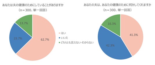さらに、夫の健康のためにしていることがあるか聞いたところ、「はい」と回答したのは62.7%だったのに対して、夫は、妻の健康のために何かしてくれるか聞いたところ、「はい」と回答したのは41.3%と、その差は21.4ポイントありました。