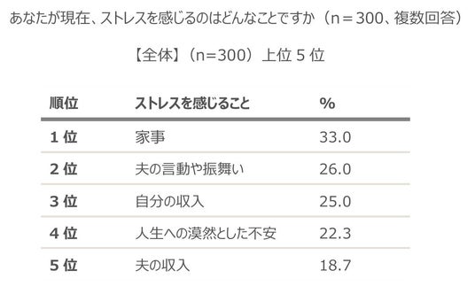 年代別で1位を見ると、20代は「家事」(51.7%〈参考値〉)、30代は「家事」(39.4%)、40代は「家事」(46.0%)、50代は「人生への漠然とした不安」(28.0%)、60代は「夫の言動や振舞い」(36.0%)、70代は「自分の健康」(28.0%)でしたが、どの年代も上位3位には「家事」が入る結果となりました。