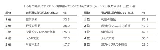 - 夫が「心身の健康」のために取り組んでいることは、1位「健康診断」(32.3%)、2位「軽度の運動」(28.0%)、3位「栄養バランスのとれた食事」(26.3%)