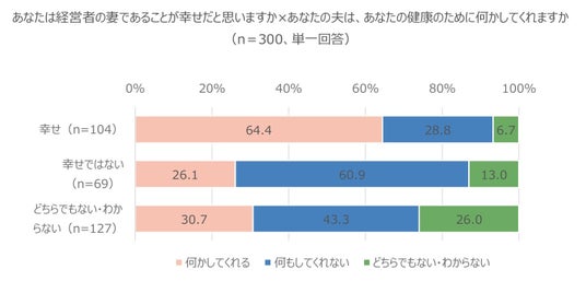 また、経営者の妻であることが幸せだと思うかの問いに「はい」と回答した104名(34.7%)のうち64.4%が、夫が妻の健康のために「何かしてくれる」と回答しています。一方、経営者の妻であることが幸せだと思うかの問いに「いいえ」と回答した69名(23.0%)のうち60.9%は、夫が妻の健康のために「何もしてくれない」と回答しています。このことから、経営者の妻の幸せには、夫が妻の健康のために何かしてくれるという思いやりの行動も関係しているようです。