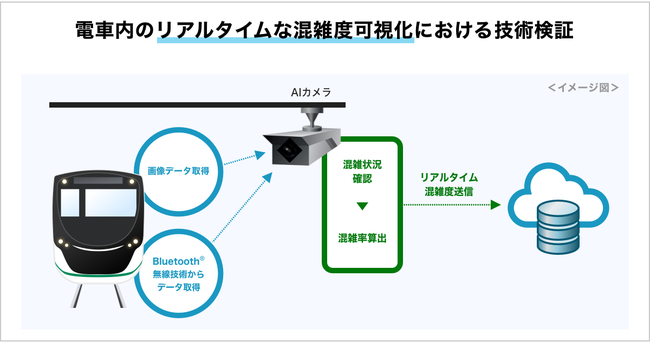 内容:ホーム先頭に設置したカメラ画像からAIを学習させ、学習したAI 及びBluetooth(R)無線技術から取得したデータを用いて列車ごとの混雑率を算出します。そのデータと乗車率データ等との精度を比較し、コンシューマー向けサービスへの展開などでの活用を目指します。