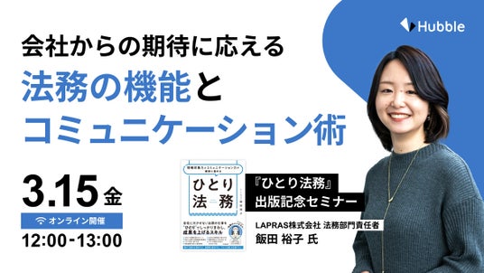法務と事業部門の協業性を高め、盤石で生産性の高い業務基盤を実現する契約業務クラウドサービス「Hubble(ハブル)」を提供する株式会社Hubble(東京都渋谷区、CEO:早川晋平)は、2024年3月15日(金)12:00-13:00にて、同日に『情報収集力とコミュニケーション力で確実に進める:ひとり法務』(同文館出版)を出版されるLAPRAS株式会社 法務部門責任者・飯田裕子氏をお招きし、「会社からの期待に応える法務の機能とコミュニケーション術~『情報収集力とコミュニケーション力で確実に進める:ひとり法務』出版記念セミナー~」と題したセミナーを開催いたします。本セミナーは事前登録制・オンライン配信です。