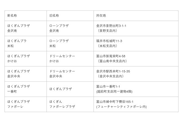 また、現在富山県内および石川県内にある個人のお客さま向けの休日相談拠点「ドリームセンター」、「ほくぎんプラザ(越前町支店一番町出張所)」及び「ほくぎんファボーレプラザ」の名称を「ほくぎんプラザ」に統一いたします。