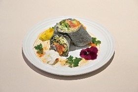 色とりどりの野菜と有機豆乳のソースを自家製トルティーヤでサンド。Flower Bomberをイメージ。