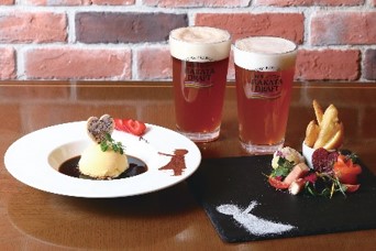 地下にある醸造所「オークラブルワリー」オリジナルの限定クラフトビールは、イギリスの伝統的なペールエールと苦味の効いたIPAの2種類。定番のフィッシュアンドチップスと前菜の盛り合わせはビールとの相性が抜群です。バニラアイスに黒ビールをかけた大人のデザートは、風船をモチーフにしたイチゴがアクセント。
