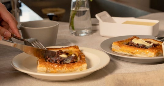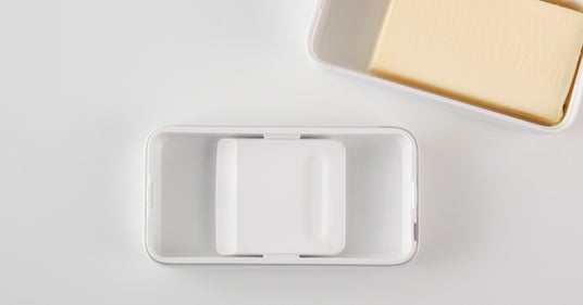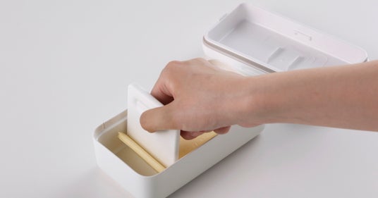 「バターケース」は、付属のカッターで使う分だけ、好みの厚さに切り分けができます。溶けやすい薄さに切ってトーストに載せたり、たっぷり使いたい時は厚めに切ったり、バターを使用した料理の幅が広がります。カッターの先端はアーチ状で、バターが刃につきにくい仕様です。ケースの内側にはバターを固定する突起が付いていて、滑らず安定して切れます。市販のバター150g、200gが入れられ、カッター幅(約5mm)に合わせると、150gのバターは約6g、200gのバターは約10gに切り分けられます。