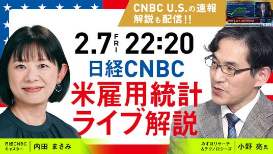 株式会社日経CNBC(本社:東京都千代田区、代表取締役社長:竹之内源市)は2月7日(金)22時20分頃から、インターネット限定番組「日経CNBC『米雇用統計ライブ解説』」を配信します。従来の有料動画配信サービス「日経CNBC online」会員(月額1650円、税込み)向けの配信に加え、今回からは公式YouTubeチャンネル有料メンバーシップ「日経CNBC ワンコイン」会員(月額490円、税込み)向けにも配信予定です。