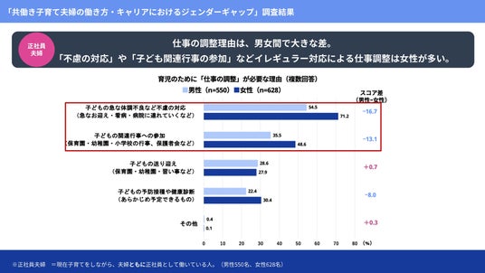 仕事の調整理由:子どもの体調不良などの不慮の対応や、子ども関連行事への参加などの緊急・イレギュラーな対応をする割合は女性の方が多い