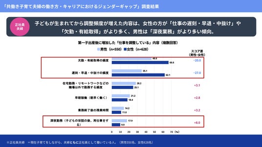 仕事の調整内容:第一子誕生後「仕事の遅刻・早退・中抜け」や「欠勤・有給取得の頻度」が増加した割合は女性の方が多い