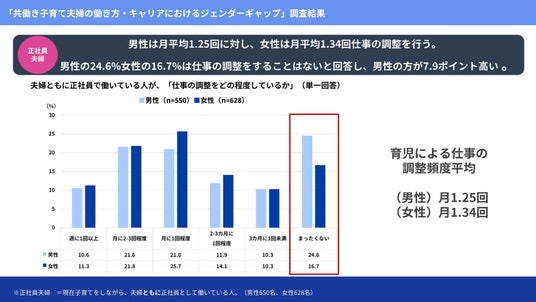 「仕事の調整頻度」は、男性が月平均1.25回に対し、女性は月平均1.34回