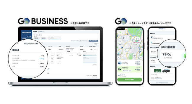 タクシーアプリ『GO』の法人向けサービス『GO BUSINESS』の管理画面において、EVタクシー車両利用による1台あたりのCO2排出量を表示し、CO2削減量の見える化を可能にします。今後注目が高まるであろうESG経営に向けた取り組みとして、まずは法人利用「GO BUSINESS」において可視化を行うだけでなく、将来的にはタクシーアプリ『GO』の一般ユーザー向けアプリ画面でも同様の表示を予定しています。
