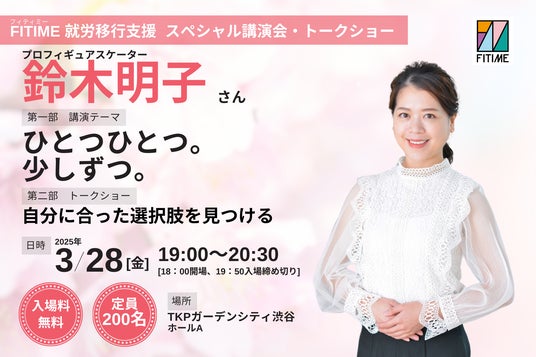 障害者就業支援を通じて“誰もが自分らしく生きる社会”を目指す株式会社スタートライン (本社:東京都三鷹市、代表取締役:西村賢治)が運営するFITIME 就労移行支援は、2025年3月28日(金)にプロフィギュアスケーター 鈴木明子氏をお招きしたスペシャル講演・トークショー「ひとつひとつ。少しずつ。」を開催することをお知らせします。