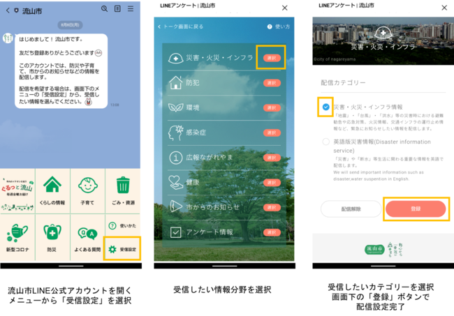流山市が配信する8つの分野(災害・火災・インフラ、防犯、環境、感染症、広場ながれやま、健康、市からのお知らせ、アンケート情報)から、利用者がほしい情報分野を登録することで希望する情報をLINEで受け取れます。