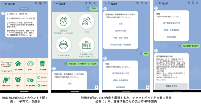 この度あたらしく開設される流山市LINE公式アカウント(@nagareyamacity)では、とくに「子育て」「防災」「ごみ資源」など複数の項目で問い合せに自動で応答するAIチャットボット機能や、希望者に対して緊急時に市民が正確な情報を入手可能な「流山市安心メール」で配信する内容の自動転送を行います。これらの情報は、利用者が希望する項目を事前に設定し、必要な情報のみを受け取ることができます。