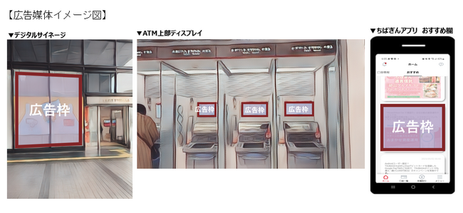 「広告媒体業務」では、千葉駅前支店の店頭デジタルサイネージ、ATM上部のディスプレイ、ちばぎんアプリのおすすめ欄等、地域性の高い当行ならではの媒体を提供します。