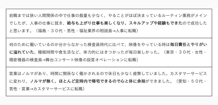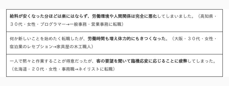 今回の調査では、異業種への転職を「失敗」だと捉える人は5.8%とごく僅かでしたが、失敗の理由をたずねたところ、「心身ともに疲れるようになった」、「仕事が楽しくなくなった・イメージと違った」、「労働環境が悪くなった」、「人間関係が悪くなった」などの声が集まりました。