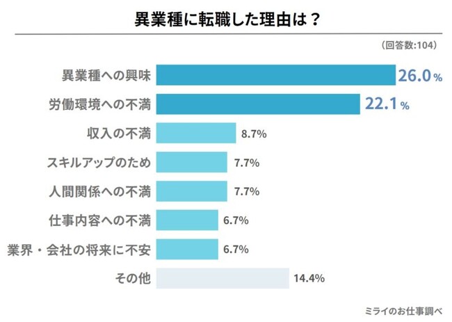 株式会社ネクストレベル(本社所在地:神奈川県横浜市、代表取締役:田中大洋)が運営するミライのお仕事(https://jobseek.ne.jp/)では、異業種への転職経験がある社会人104名を対象に、異業種への転職理由や実態を聞いてみました。