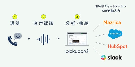 会話サマリーAI電話「pickupon(ピクポン)」は、AIが電話で話した内容のサマリーをテキスト×音声で作成し、自動入力・共有してくれるサービスです。入力を意識せず、顧客との会話内容をチームのワークスペース(CRM・SFAなど)へシェアします。これにより、営業の架電シーンにおける入力漏れを防ぎ、入力コストを削減し、営業活動のブラックボックス化問題を解決します。