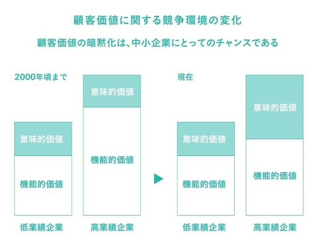 2000年頃までは機能や品質が高い商品を作り出すことが企業の好業績につながっていました。しかし社会の変化により顧客志向が変化し、近年の高業績企業をみると、製品のスペックや機能(機能的価値)だけでなく、使ってみて初めて分かる使い心地やワクワクするデザイン(意味的価値)の重要性が増しています。多くの日本企業はこうした変化に対応できておらず、意思決定が早く、経営者の哲学が事業に反映されやすい中小企業こそ、いち早く取り組んでいくべきであると本市では考えています。