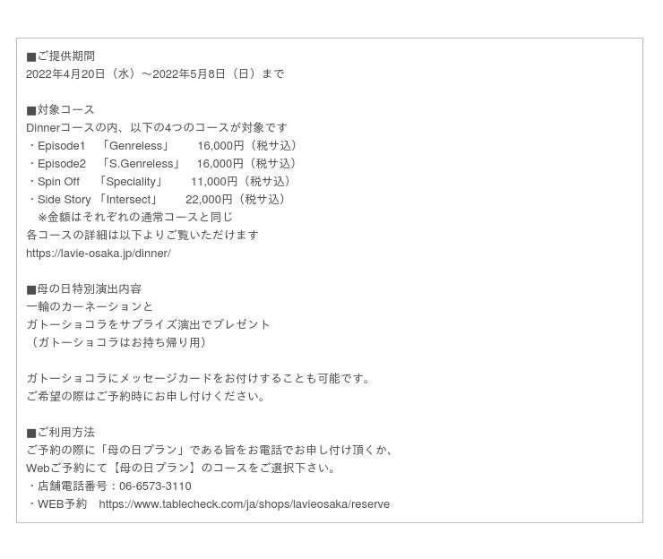 GLIONグループ(ジーライオングループ 所在地:兵庫県神戸市)は、同グループが運営する大阪築港・赤レンガ倉庫のLA VIE 1923にて2022年4月20日(水)から2022年5月8日(日)までの期間限定で、サプライズ演出が付いた母の日限定プランのDinner Courseを販売致します。