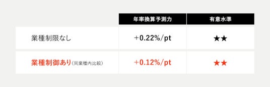 業種制御による検証は極めて重要です。特定業界の好不調(業界全体の浮沈)の影響を統計的に除去した上でも正の関連が残ることは、同業種内においても「開示の質」が高い企業ほどリターンが良い傾向にあることを示しています。