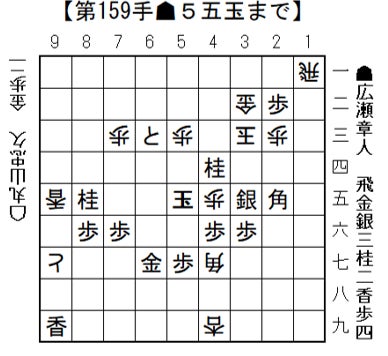 ▲同 金 △4七角 ▲5五玉 まで159手で先手の勝ち