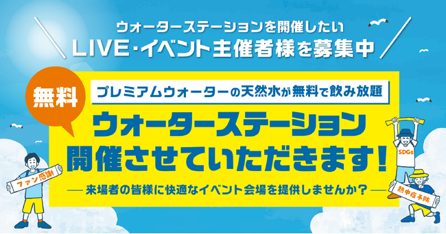 庭に提供しているプレミアムウォーター株式会社(所在地:東京都渋谷区、代表取締役社長:金本 彰彦)は、2024年6月3日(月)よりマイボトルやペットボトルご持参でプレミアムウォーターの天然水が無料で飲めるウォーターステーションを開催したいLIVE・イベント主催者様の募集を開始いたします。