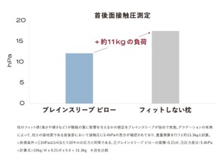 上記検証の結果、フィットしない枕(グラデーション構造がない枕)で寝た場合、ブレインスリープ ピロー(グラデーション構造がある枕)で寝た場合と比べて、枕の接地面である首後面に5.4hPaの圧力が多くかかっていることがわかりました。5.4hPaの圧力は、重量換算すると約11kgに相当するため、グラデーションの有無によって、11kgの重さが肩や首に追加でかかっていることを意味します。
