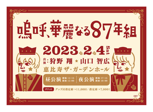 本イベントは、「アイドルマスターSideM」や「東京リベンジャーズ」等で知られる狩野と、「あんさんぶるスターズ!!」や「ぷにるんず」等で活躍する山口が、華やかに美しく活動する団体というコンセプトの元「嗚呼、華麗なる87年組」を発足させ、年男となる2023年に開催するもので、イベントでは、トークセッションはもとより、事前に収録した二人の挑戦映像を公開する他、来場者向けのプレゼント抽選企画、生挑戦企画等、来場者が参加して楽しめる内容を予定している。