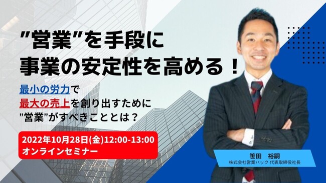「ご支援先の売上を2年で2倍にする」を掲げ、営業コンサルティング及び営業企画代行を行っている株式会社営業ハック(本社:東京都港区、代表取締役:笹田裕嗣)は10月28日(金)12:00~13:00に無料ウェビナーを開催いたします。今回のテーマは「事業の安定化」です。経営リスクの高い状況が続く昨今、会社・事業の売上が特定のお客様に依存した状態は非常に危険だと言えます。そこで営業ハックがこれまで「営業」という手段を駆使し、事業の安定性を高めたり、顧客依存体質の脱却を支援してきたノウハウをお話いたします。売上アップのためのヒントをご紹介させていただきます。