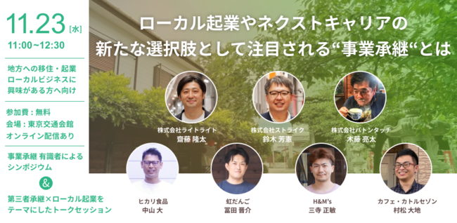 イベントでは実際に事業承継で新たな一歩を踏み出された事業者さんにご登壇いただき、リアルなご経験談をお話しいただきます。後半は、「第三者承継×ローカル起業」をテーマにトークセッションを予定しています。